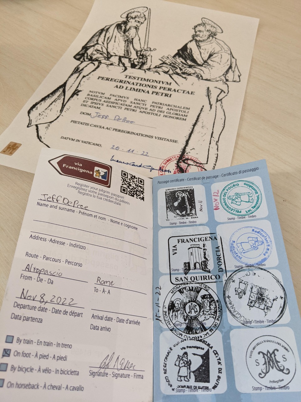 300ish miles through the walled towns of Tuscany. November 7 - 21, 2022 -- compiled by Jeff DePree featured on jeffdepree.com The Via Francigena was rediscovered around the same time as the Spanish Caminos, but while the latter have exploded in popularity, the Francigena has remained relatively obscure. It starts in England, but I didn’t want to traverse the Alps in November, so I started near Lucca in Italy. Aside from the final 10-mile segment through suburban Rome, every day on this stretch is filled with ancient walled towns and beautiful Tuscan landscapes, with very minimal road-walking. I also hiked the Cinque Terre, because I had arrived in Italy via a $10 flight to Genoa and it was on the way. Weather Unlike on previous European walks, I actually got rained on three days out of twelve, so it was lucky that I had brought a rain jacket, rain pants, and pack cover. The temperatures were generally pretty perfect. It typically got dark around 5, which limited me to a mere ten walking hours per day. Food I got the sense that there was lots of delicious Italian food to be had, but I had no idea how to order it. I was hoping for daily menus, where one could get a four-course meal of whatever was on-hand for 10 euros, but I only found a few of these. Usually, just the first course alone, with the requisite bread, water, and cover charges, would run around 15 euros for a very meager portion of pasta. I typically subsisted on pizza, which was pretty ubiquitous, and only two bucks for a hefty slice. Coffee was doled out in tiny portions for a dollar a cup. On the last day, I found a chain called 12oz coffee that prided itself on its absurdly voluminous 12oz cups. Lodging I ran into an Australian woman who had hiked all the way from Canterbury and never paid more than $20 for a night’s stay. The cheaper options usually involve calling around and staying at monasteries. Since I was looking to work every night, I largely opted for rooms and apartments in the $30-60 range. Wifi was spotty, but I had a $25 sim that gave me 50gb for the month and worked pretty much everywhere, so I almost always had a fallback. I did stay in one convent - the nuns ignored me for three hours, but eventually gave me a massive dinner, comfy private room, and breakfast for $30. www.strava.com/activities/8082916840 ![]() ![]() ![]()